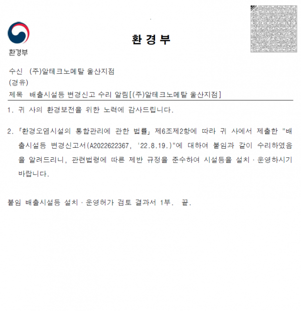 [통합환경 변경신고] 비철_(주)알테크노메탈 울산지점 신고 완료