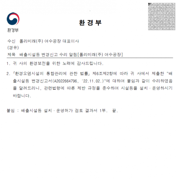 2022년 11월 17일 "(주)폴리미래 여수공장" 변경신고를 최종 완료하였습니다.