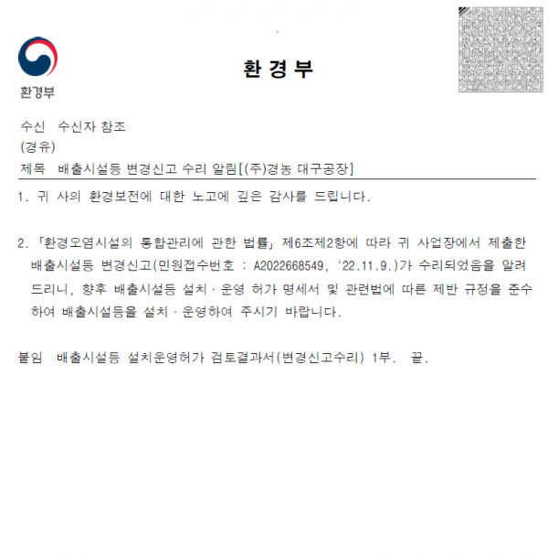 2022년 11월 21일 "(주)경농 대구공장" 변경신고를 최종 완료하였습니다.