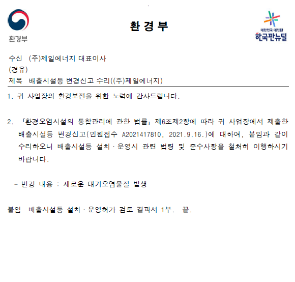 [통합환경 변경신고] 소각_(주)제일에너지 신고 완료