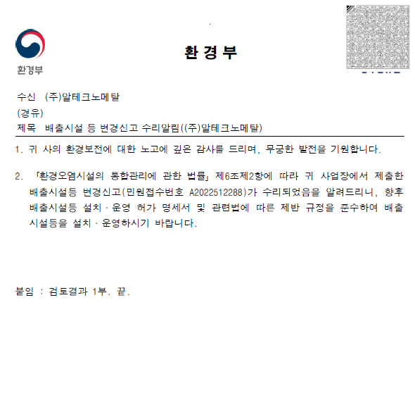 [통합환경 변경신고] 비철_(주)알테크노메탈 신고 완료