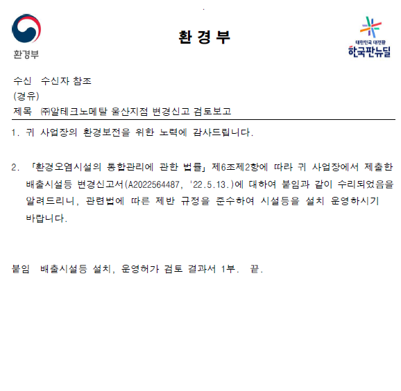 [통합환경 변경신고] 비철_(주)알테크노메탈 울산지점 신고 완료