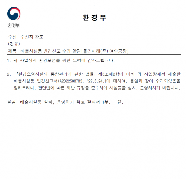 [통합환경 변경신고] 유기화학_(주)폴리미래 여수공장 신고 완료