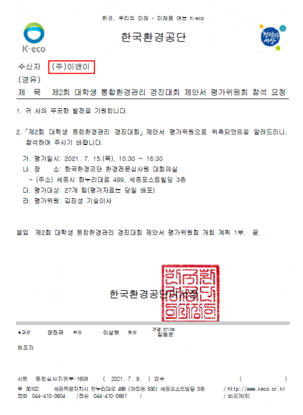 [선정] 한국환경공단_제2회 대학생 통합환경관리 경진대회 제안서 (주)이앤이 평가위원 위촉